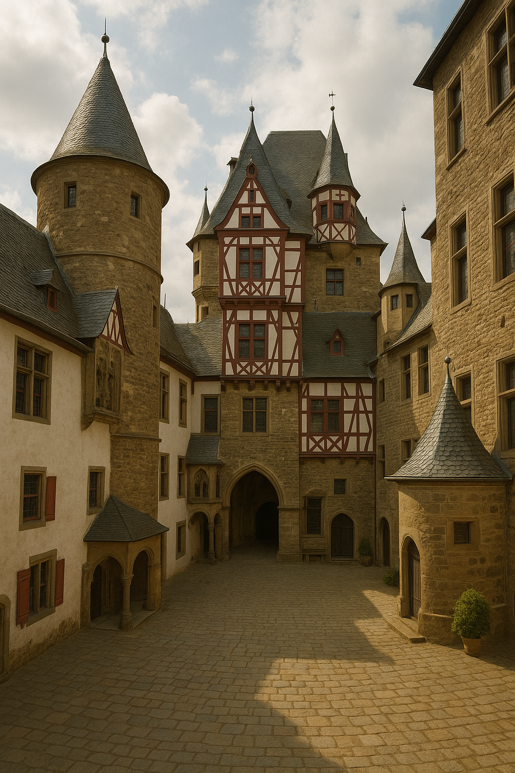 - 14.–16. Jahrhundert: Gotische und frühneuzeitliche Erweiterungen; Fachwerkaufbauten, Repräsentationsräume.